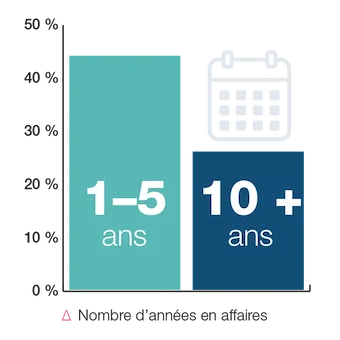 Durée moyenne d'activité : 7 ans ; 44 % sont en activité depuis 1 à 5